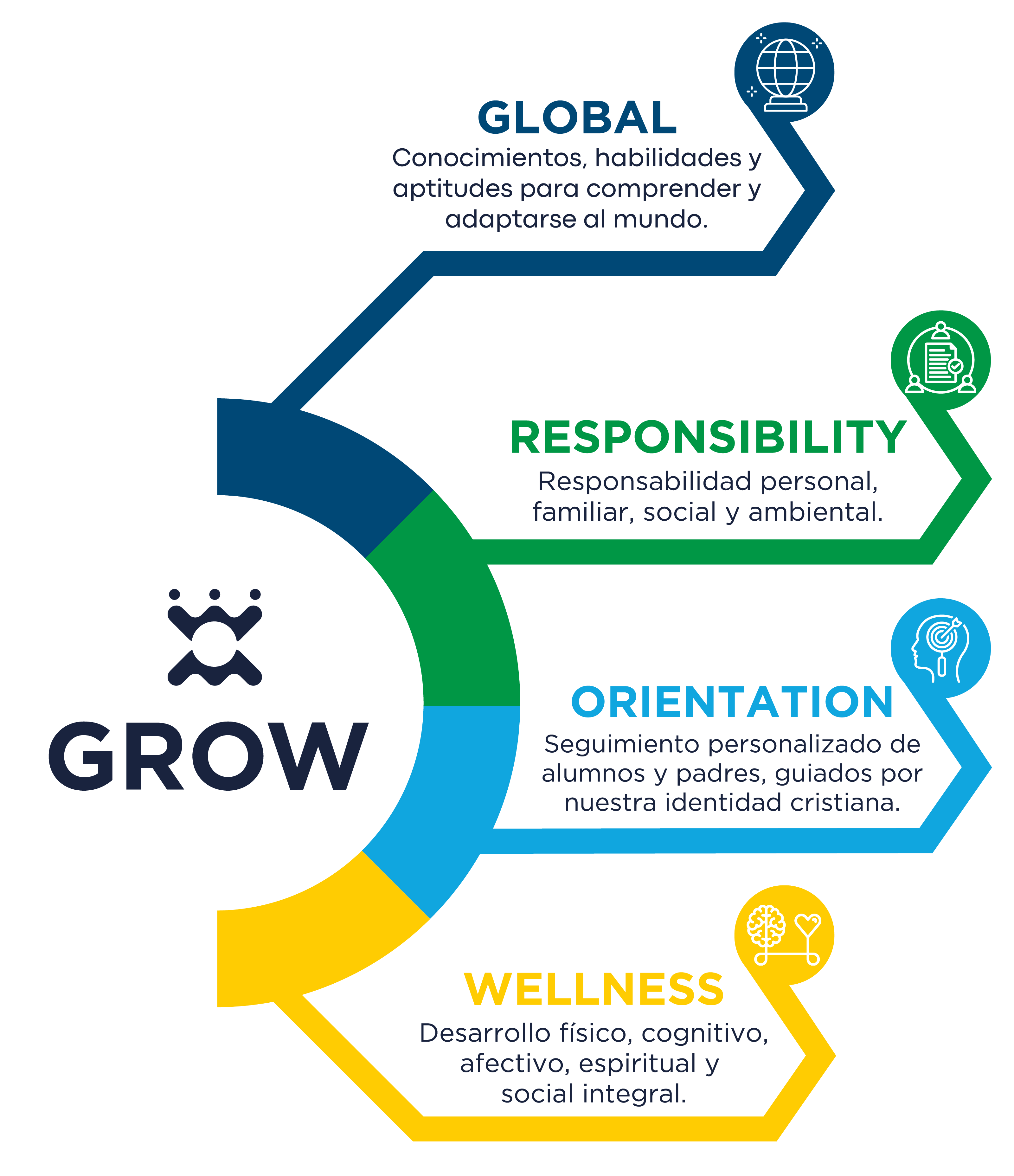 GROW es el modelo educativo de los colegios Cedros Norte, Paseo y Kinder Cedros Norte, enfocado en el desarrollo integral de los estudiantes a través de cuatro pilares fundamentales.